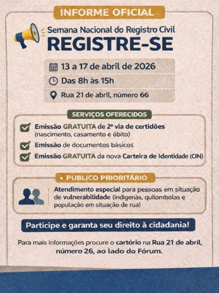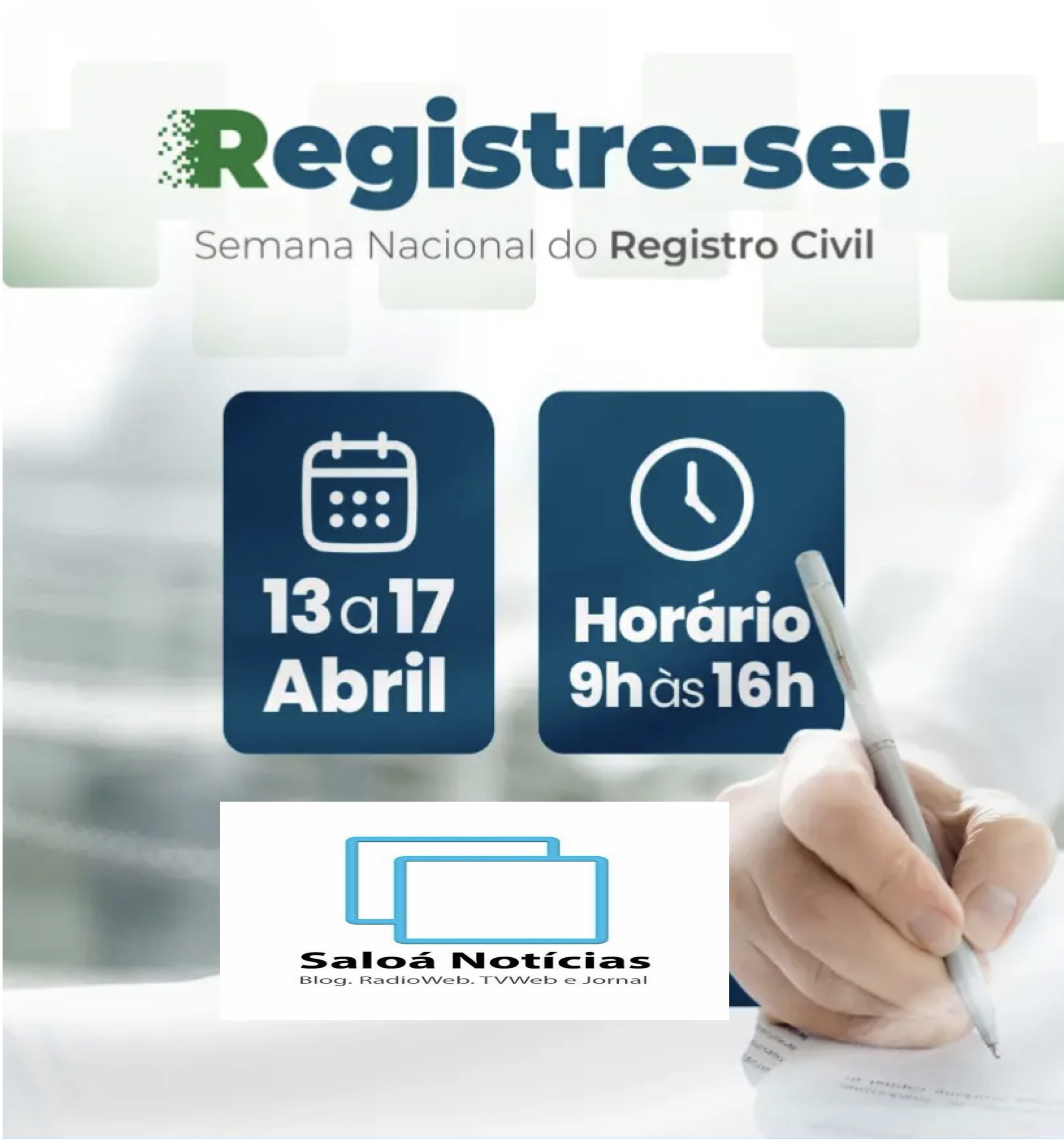A população de Saloá, no Agreste de Pernambuco, terá acesso a uma série de serviços gratuitos durante a Semana Nacional do Registro Civil – “Registre-se”, que será realizada entre os dias 13 e 17 de abril de 2026. A iniciativa acontece das 8h às 15h, na Rua 21 de Abril, número 66, com foco na garantia do direito à documentação básica e ao exercício da cidadania.
