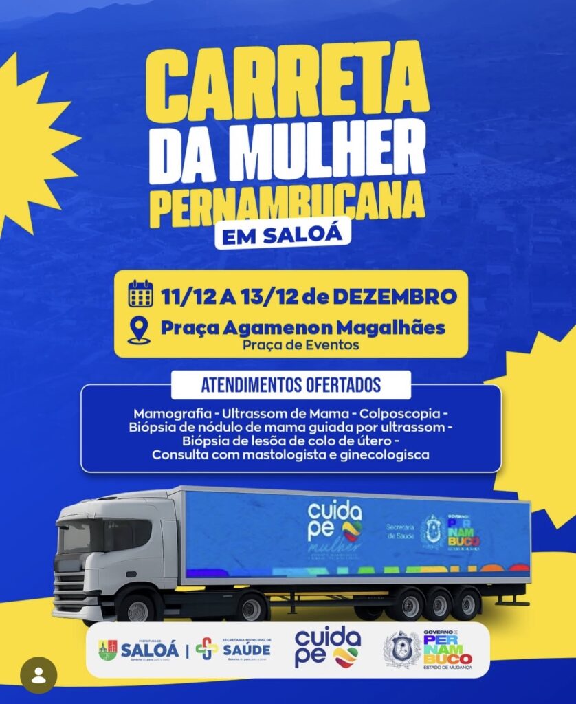 Saloá receberá, entre os dias 11 e 13 de dezembro, a Carreta da Mulher, uma importante iniciativa voltada para a promoção da saúde feminina. A unidade móvel ficará instalada na Praça Agamenon Magalhães, no centro da cidade, oferecendo uma ampla gama de serviços gratuitos e especializados.