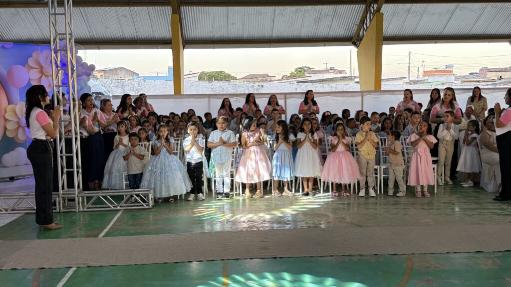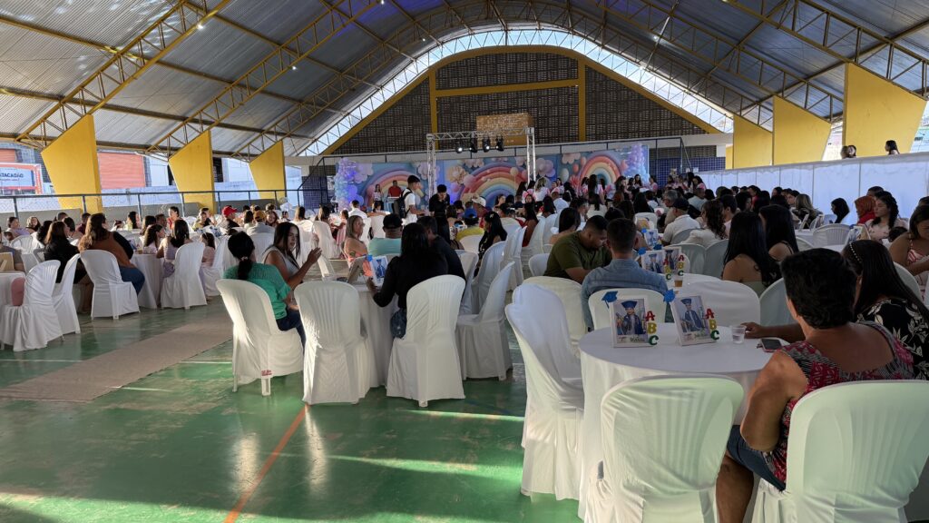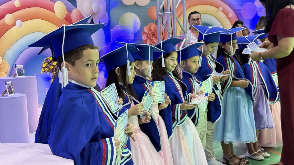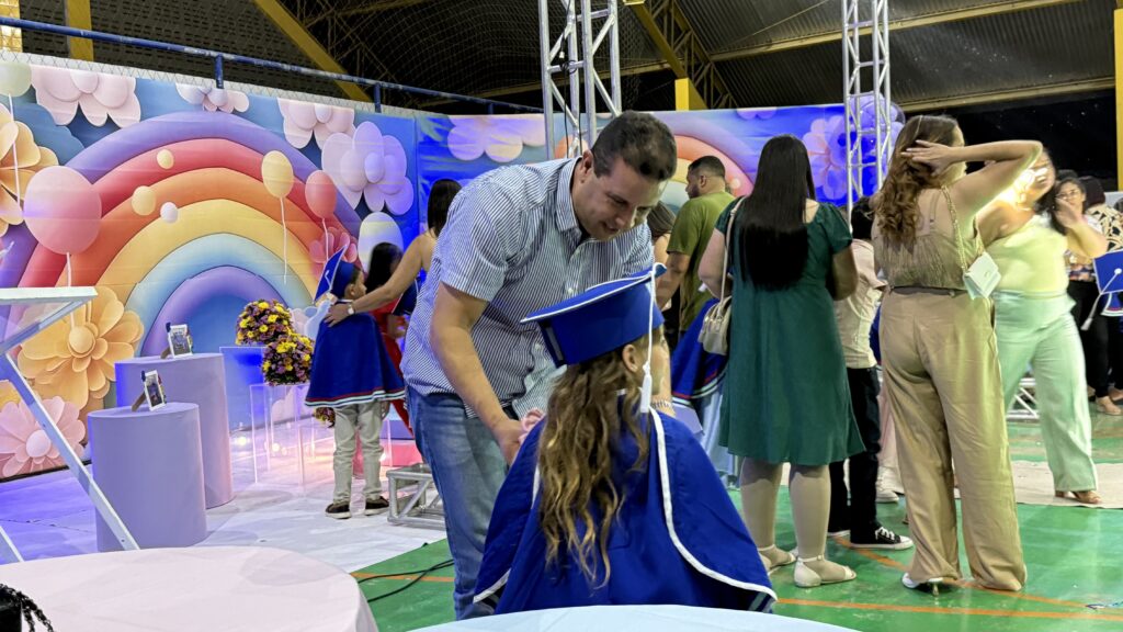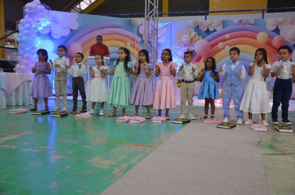 A solenidade reuniu familiares, educadores e autoridades locais, entre elas o prefeito Júnior de Rivaldo, que prestigiou a celebração ao lado de representantes da Secretaria Municipal de Educação e demais convidados. A programação contou com apresentações lúdicas, decoração temática e a entrega de certificados, em um momento de emoção para pais e responsáveis.