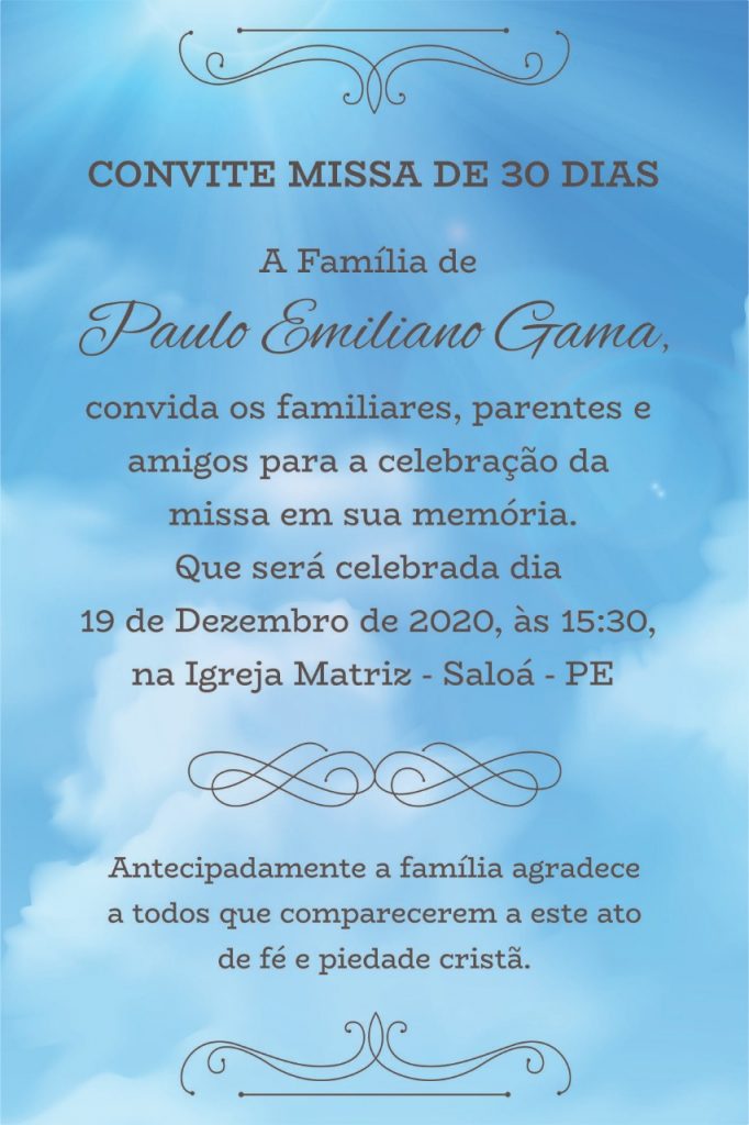 O vazio que ficou jamais será preenchido, mas com a paz de Deus em nossos corações será bem menos difícil. O céu comemorará um mês de vida eterna de uma pessoa muito querida, que para sempre estará em nossa memória e influenciará eternamente a nossa história. Saudades eternas: Desta forma, a família de Paulo Emiliano Gama (Paulo Gama) convida os parentes e amigos para participarem da missa de 30º dia que será realizada no dia 19 de dezembro 2020, às 15h na Igreja da Paróquia de São Vicente de Paulo, agradecendo desde já, aos que comparecerem a este ato de fé e irmandade cristã.