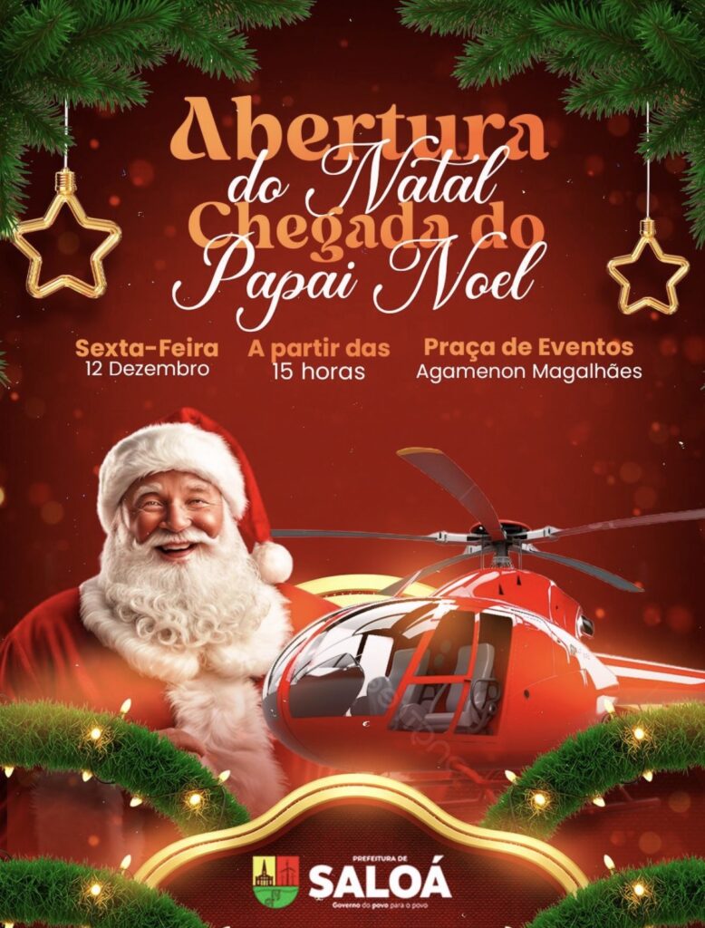 Saloá viverá uma tarde e noite de pura magia nesta sexta-feira (12/12/2025). Às 15h, o Papai Noel chegará de helicóptero à Praça Agamenon Magalhães, no centro da cidade, em um momento muito aguardado pelas famílias saloaenses. A cena promete encantar crianças e adultos, marcando de forma especial a abertura das festividades natalinas do município.