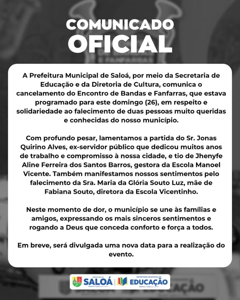 A Prefeitura Municipal de Saloá anunciou, na manhã deste domingo (26), o cancelamento da Segunda Edição do Encontro de Bandas e Fanfarras, que estava programada para acontecer ainda hoje. A decisão foi tomada em respeito ao falecimento do ex-servidor público Jonas Quirino e da Sra. Maria da Glória Souto Luiz, ambos ocorridos nesta manhã.