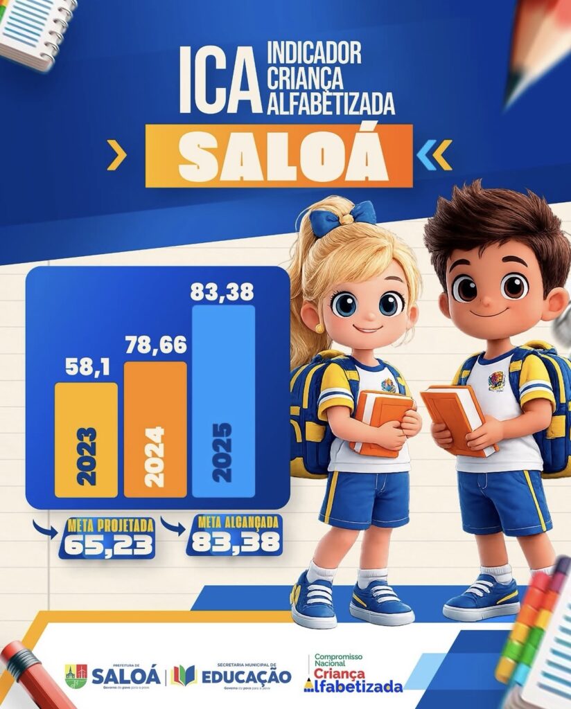 O município de Saloá comemorou um expressivo avanço na área educacional ao alcançar um excelente desempenho nos Indicadores do Programa Criança Alfabetizada. Os números refletem o fortalecimento das políticas públicas voltadas à alfabetização e evidenciam a evolução da qualidade do ensino ofertado na rede municipal.