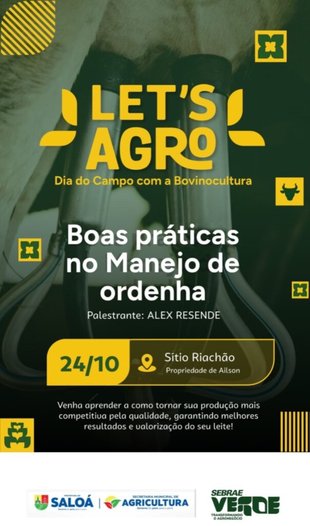 No dia 24 de Outubro de 2025, às 9h da manhã, no Sítio Riachão, na propriedade de Ailson Bagaceira, acontecerá o encontro “Boas Práticas no Manejo de Ordenha”, um momento dedicado a fortalecer a qualidade da produção leiteira e aprimorar o manejo na sua propriedade.